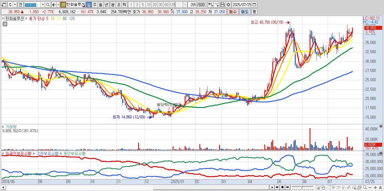 - 한화솔루션 (39,000원 ▲ 2.9% , 시총: 67,038억, 외국인 순매수 거래금:181억)