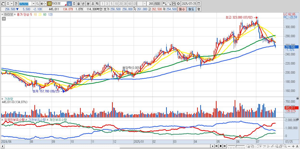 - 하이브 (256,500원 ▼ -2.1% , 시총: 106,838억, 외국인 순매수 거래금:131억)