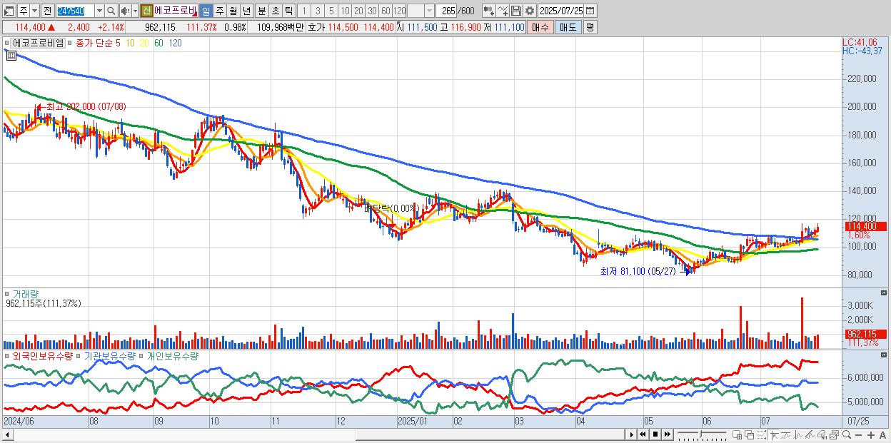 - 에코프로비엠 (114,600원 ▲ 2.32% , 시총: 112,080억, 외국인 순매수 거래금:112억)