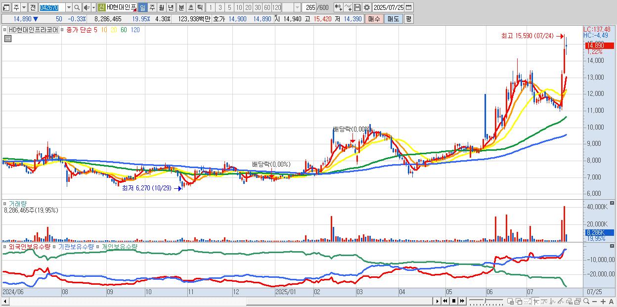 - HD현대인프라코어 (14,870원 ▼ -0.47% , 시총: 28,638억, 외국인 순매수 거래금:124억)