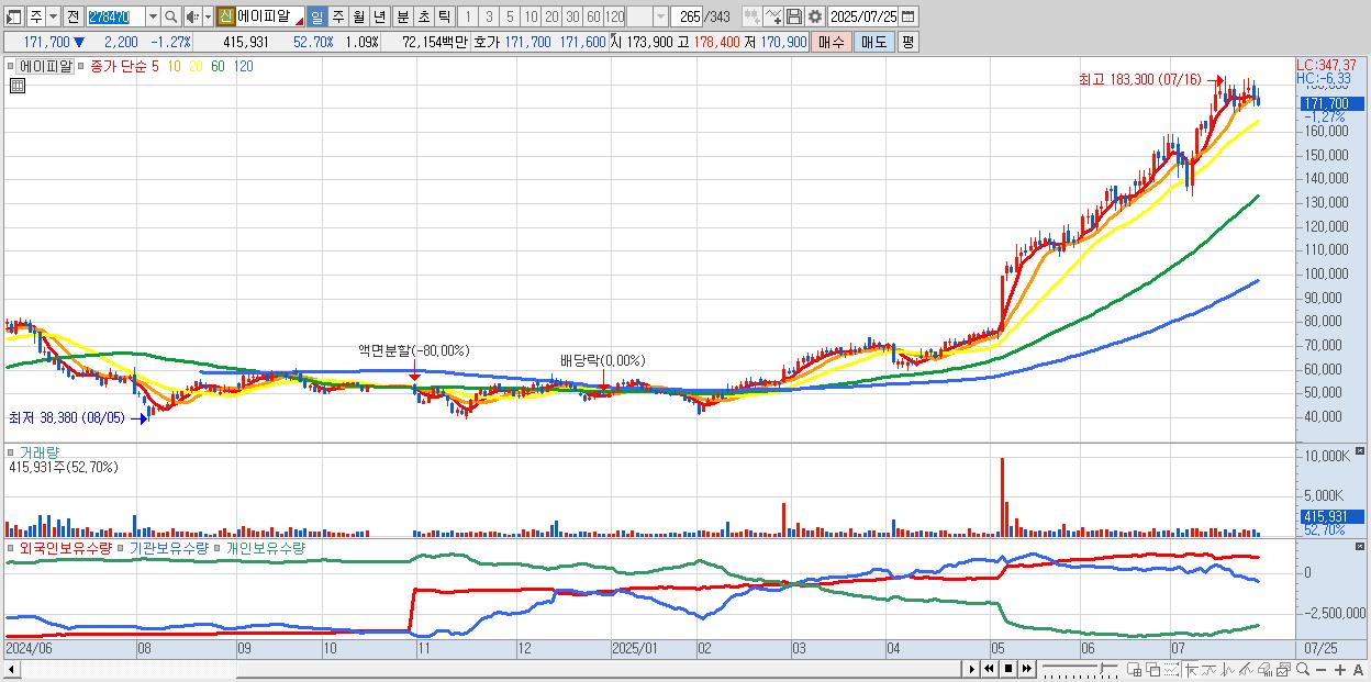 - 에이피알 (171,700원 ▼ -1.27% , 시총: 65,322억, 외국인 순매수 거래금:112억)