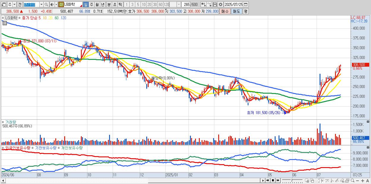 - LG화학 (307,000원 ▲ 0.66% , 시총: 216,718억, 외국인 순매수 거래금:105억)