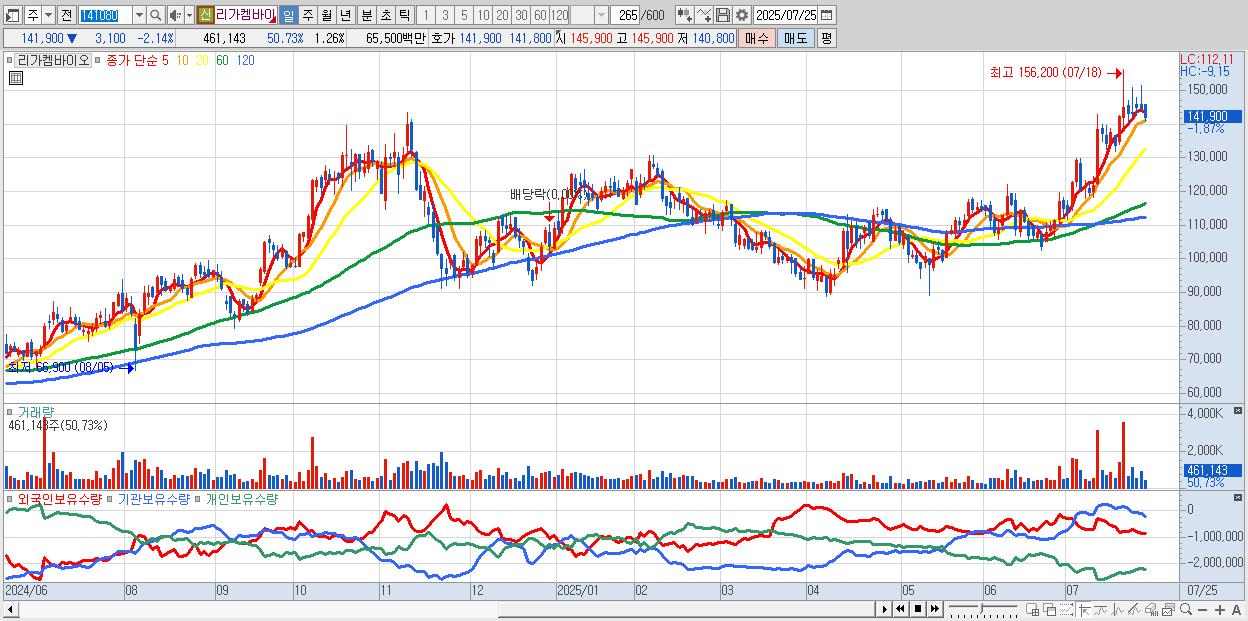 - 리가켐바이오 (141,500원 ▼ -2.41% , 시총: 51,804억, 외국인 순매수 거래금:136억)