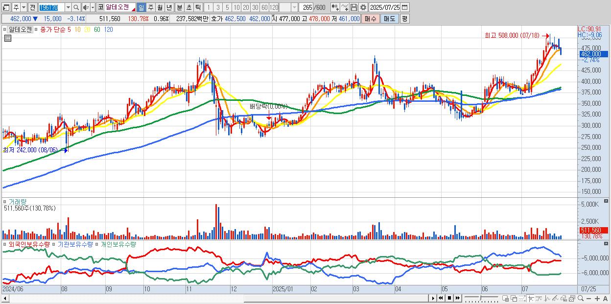 - 알테오젠 (462,000원 ▼ -3.14% , 시총: 247,008억, 외국인 순매수 거래금:200억)