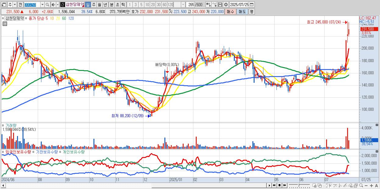 - 삼천당제약 (230,000원 ▲ 2% , 시총: 53,952억, 외국인 순매수 거래금:399억)