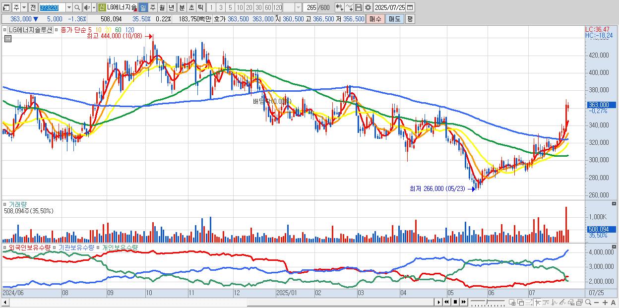 - LG에너지솔루션 (363,500원 ▼ -1.22% , 시총: 850,590억, 거래량: 379,275, 거래대금:1,372억)