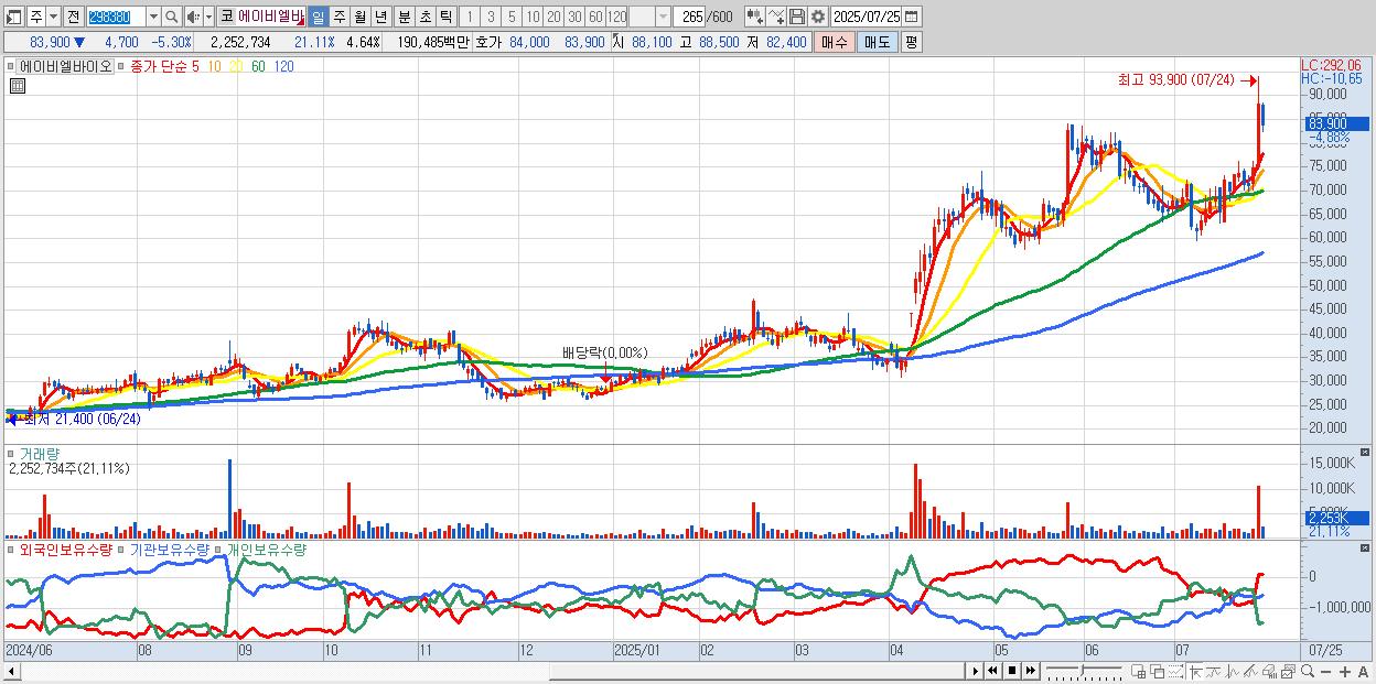 - 에이비엘바이오 (83,800원 ▼ -5.42% , 시총: 40,666억, 거래량: 1,280,534, 거래대금:1,079억)