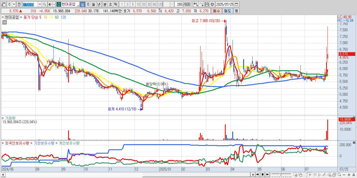 - 현대공업 (6,570원 ▲ 4.95% , 시총: 1,008억, 거래량: 19,968,084, 거래대금:1,411억)