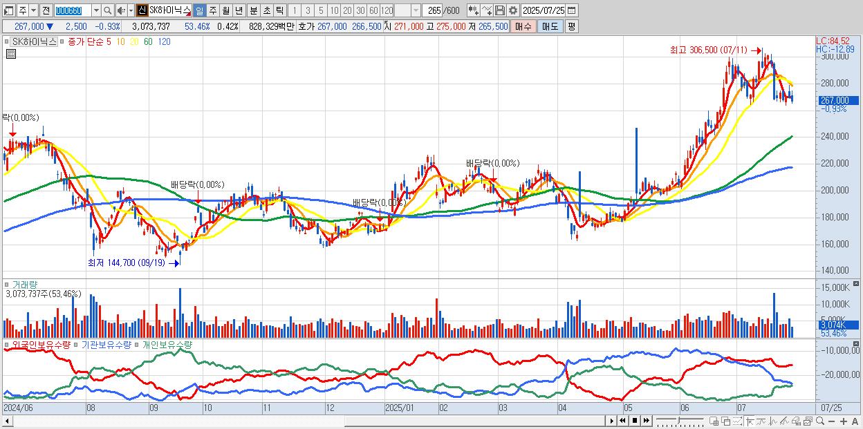 - SK하이닉스 (266,000원 ▼ -1.3% , 시총: 1,936,486억, 거래량: 2,171,063, 거래대금:5,848억)
