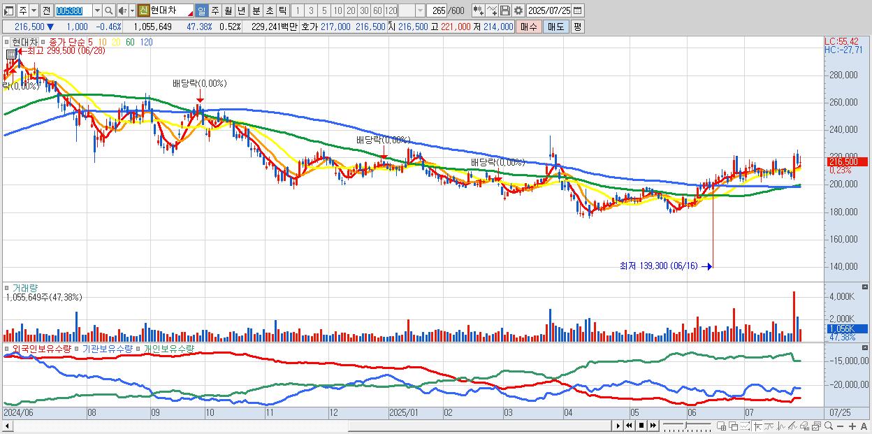 - 현대차 (216,500원 ▼ -0.46% , 시총: 443,301억, 거래량: 665,815, 거래대금:1,446억)