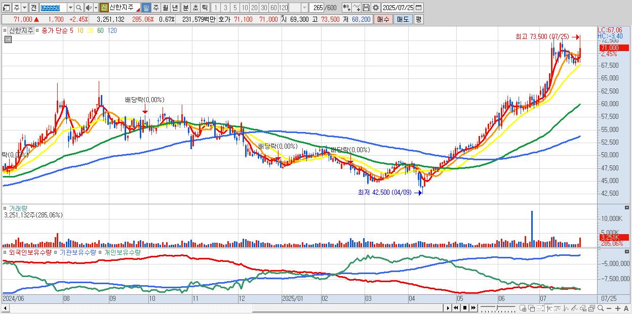 - 신한지주 (71,200원 ▲ 2.74% , 시총: 345,672억, 거래량: 2,558,748, 거래대금:1,822억)