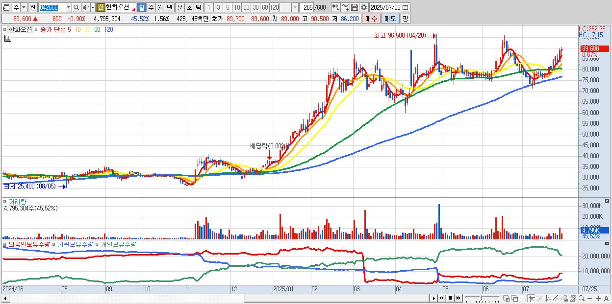 - 한화오션 (90,000원 ▲ 1.35% , 시총: 275,772억, 거래량: 2,582,320, 거래대금:2,290억)