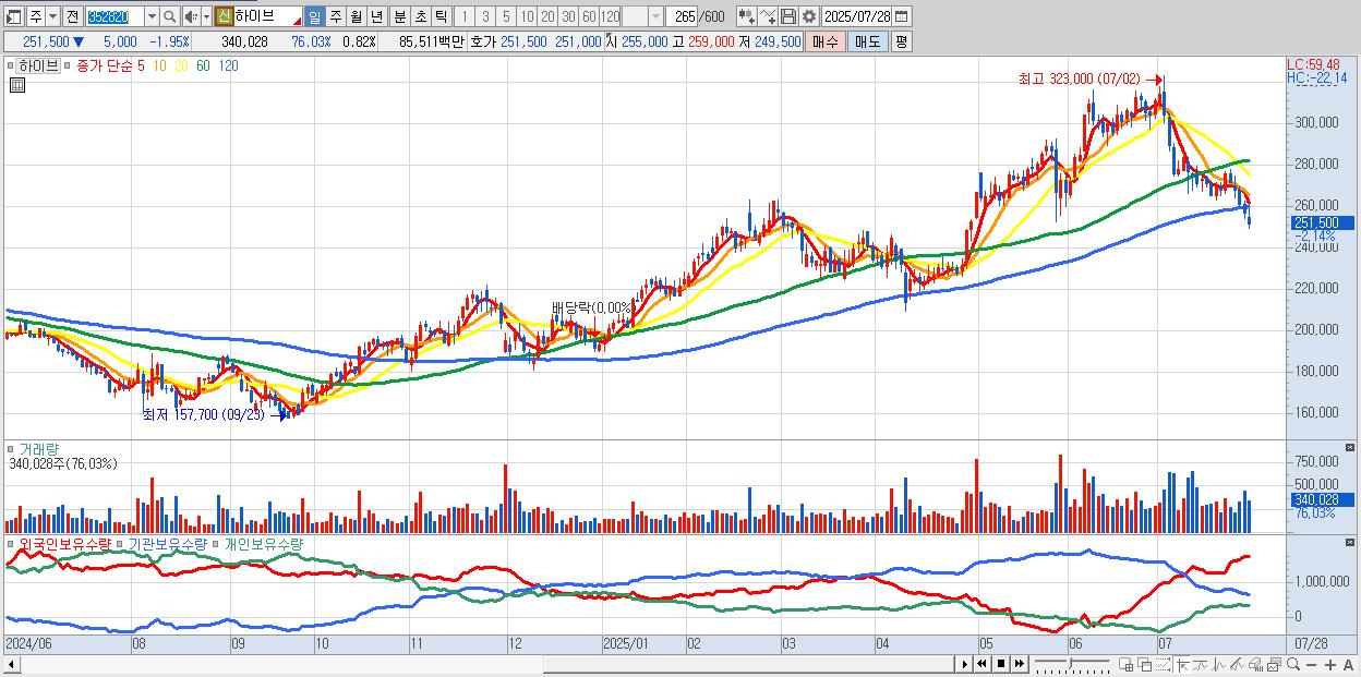 - 하이브 (251,500원 ▼ -1.95% , 시총: 104,755억, 외국인 순매수 거래금:98억)