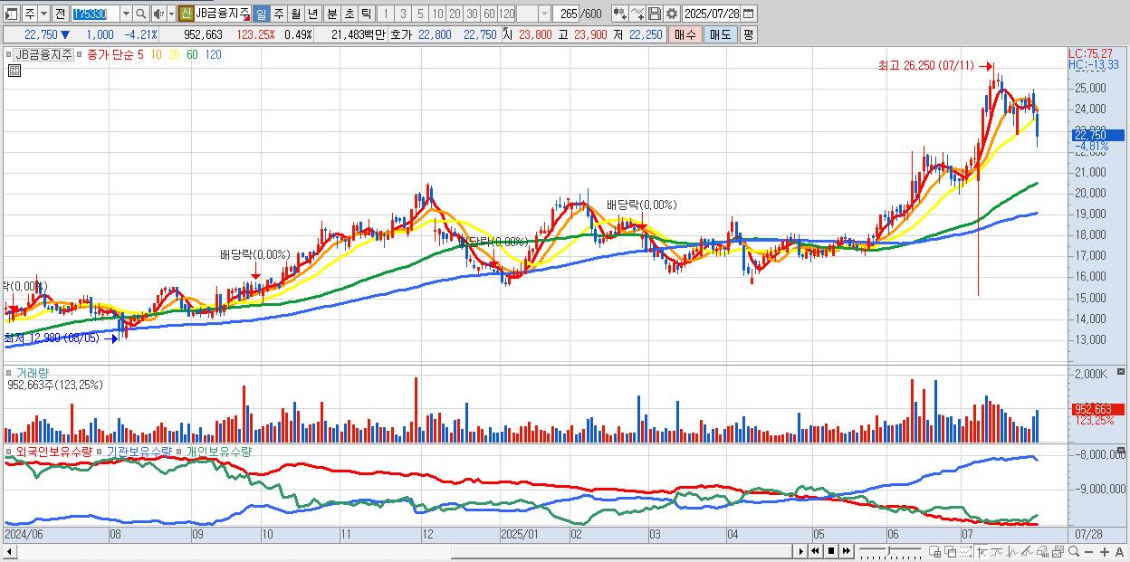 - JB금융지주 (22,550원 ▼ -5.05% , 시총: 43,726억, 외국인 순매수 거래금:73억)