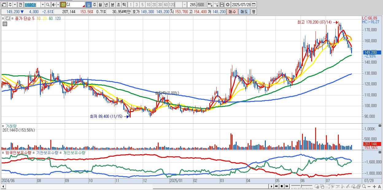 - CJ (149,500원 ▼ -2.42% , 시총: 43,620억, 외국인 순매수 거래금:98억)