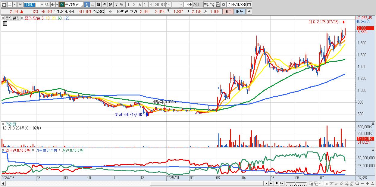 - 동양철관 (2,050원 ▲ 6.38% , 시총: 3,276억, 외국인 순매수 거래금:75억)