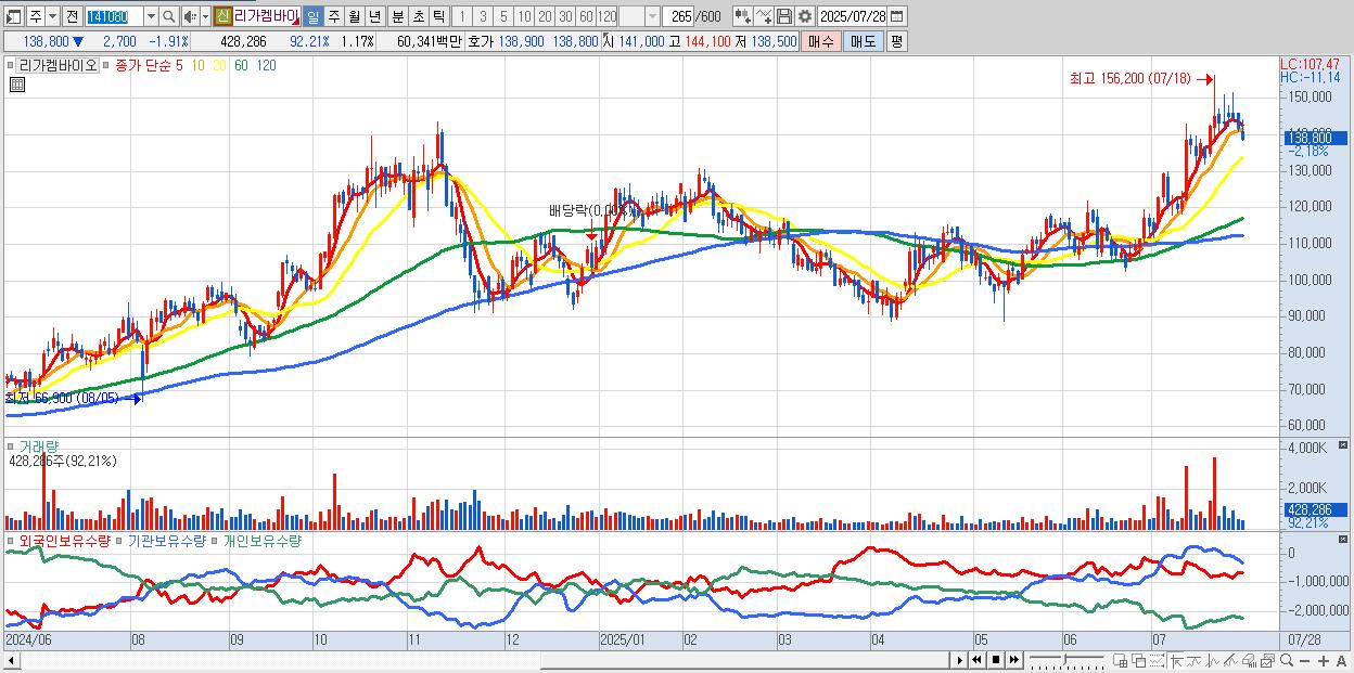 - 리가켐바이오 (139,900원 ▼ -1.13% , 시총: 51,218억, 외국인 순매수 거래금:119억)