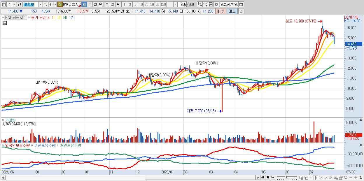 - BNK금융지주 (14,430원 ▼ -4.94% , 시총: 45,943억, 외국인 순매수 거래금:99억)
