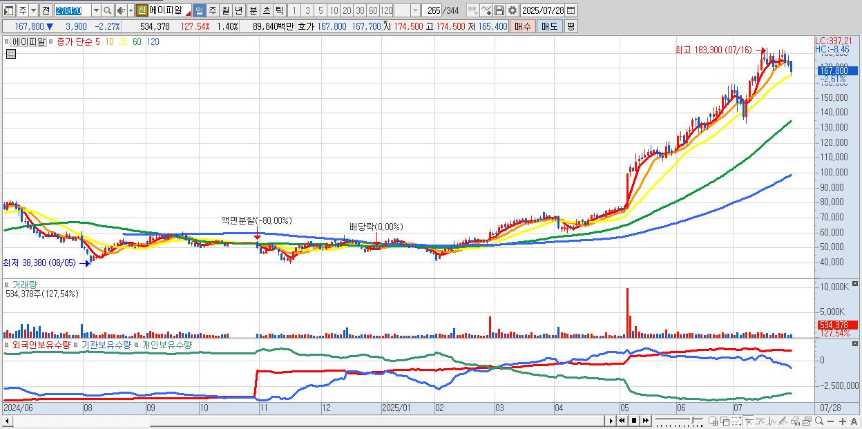 - 에이피알 (167,500원 ▼ -2.45% , 시총: 63,724억, 외국인 순매수 거래금:134억)