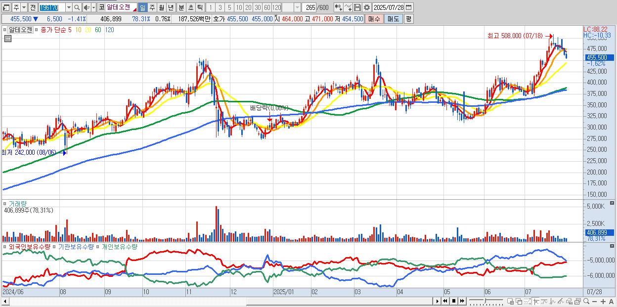 - 알테오젠 (457,000원 ▼ -1.08% , 시총: 244,335억, 외국인 순매수 거래금:107억)