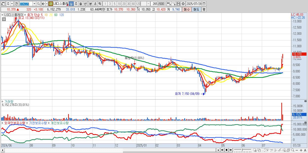 - LG디스플레이 (10,400원 ▲ 3.48% , 시총: 52,000억, 외국인 순매수 거래금:170억)