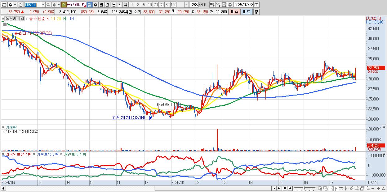 - 동진쎄미켐 (32,550원 ▲ 9.23% , 시총: 16,735억, 외국인 순매수 거래금:84억)