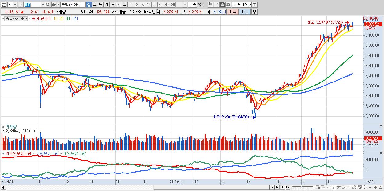 | 07/25 | 3,196.05 | ▲0.18% | -4,616억 | 2,706억 | 1,100억 | 810억 |