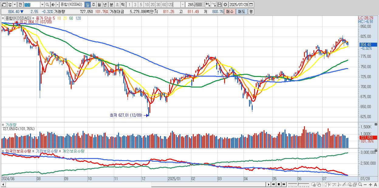 | 07/25 | 806.95 | ▼-0.36% | 735억 | 928억 | -1,402억 | -261억 |