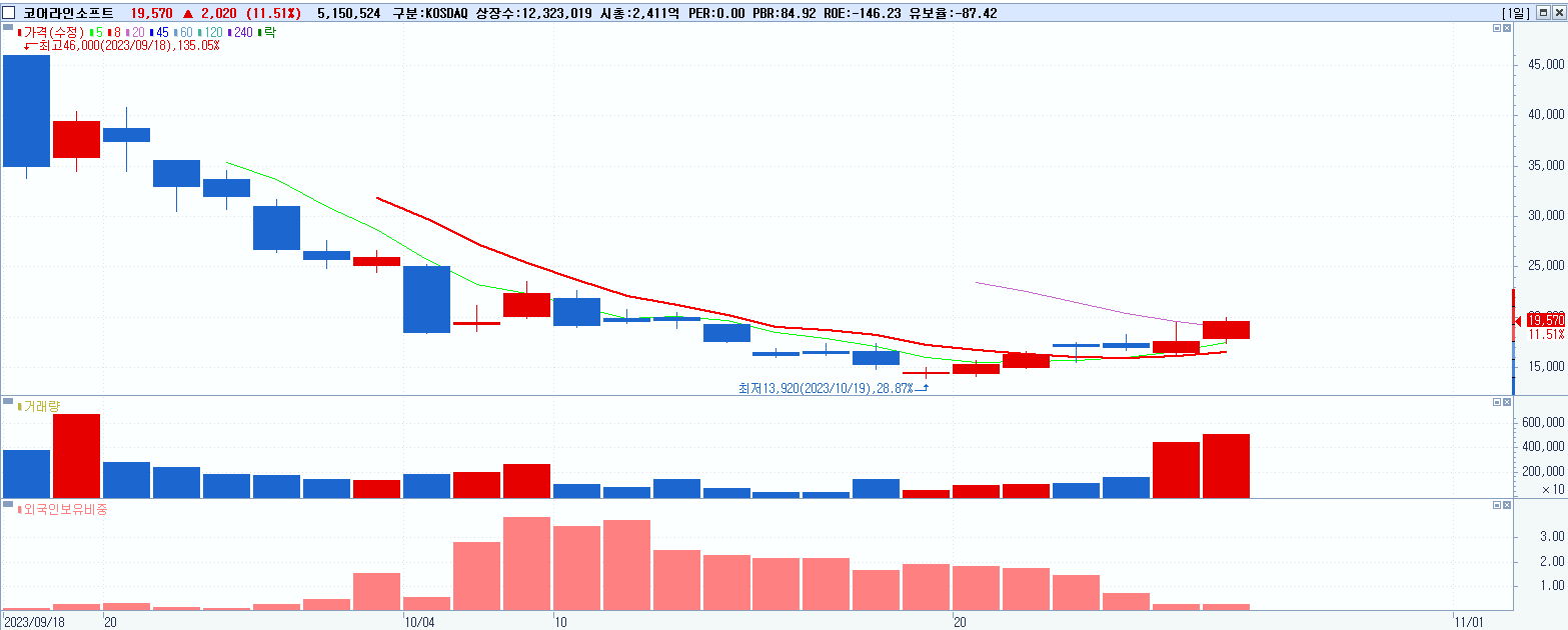 - 코어라인소프트 (19,570원 ▲ 11.51% , 시총: 2,412억, 거래량: 5,347,309, 거래대금:1,016억)