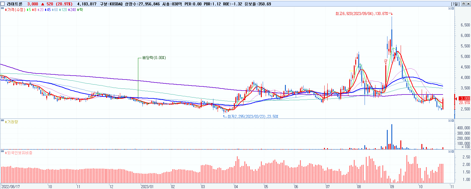 - 라이트론 (3,000원 ▲ 20.97% , 시총: 839억, 거래량: 4,212,884, 거래대금:122억)