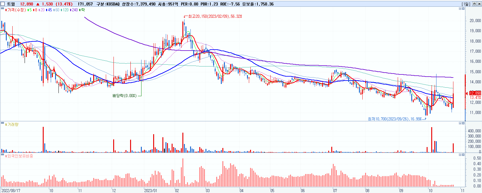 - 트윔 (12,890원 ▲ 13.47% , 시총: 951억, 거래량: 171,102, 거래대금:22억)