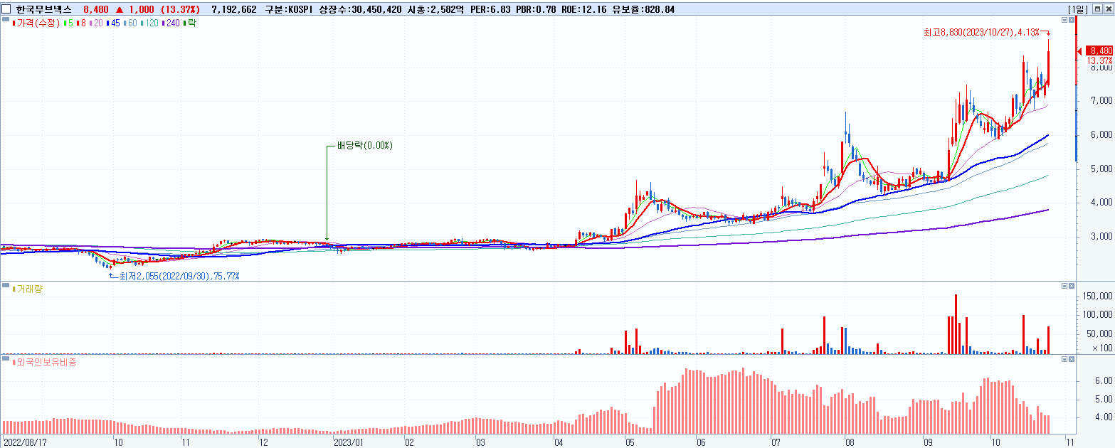 - 한국무브넥스 (8,480원 ▲ 13.37% , 시총: 2,582억, 거래량: 7,250,320, 거래대금:606억)