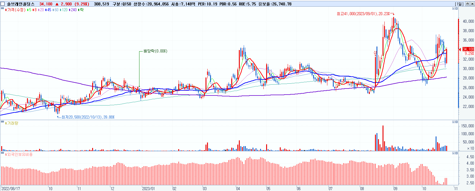 - 솔브레인홀딩스 (34,100원 ▲ 9.29% , 시총: 7,149억, 거래량: 309,489, 거래대금:103억)