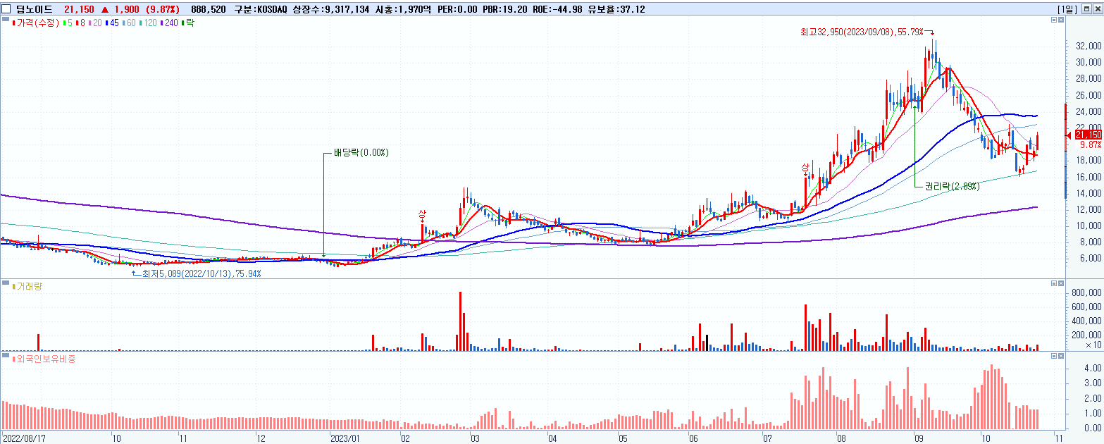 - 딥노이드 (21,150원 ▲ 9.87% , 시총: 1,971억, 거래량: 894,513, 거래대금:185억)