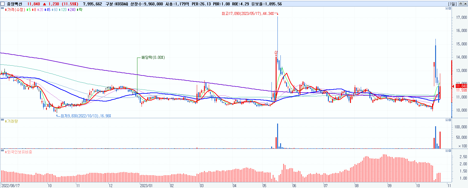 - 중앙백신 (11,840원 ▲ 11.59% , 시총: 1,179억, 거래량: 8,042,388, 거래대금:970억)