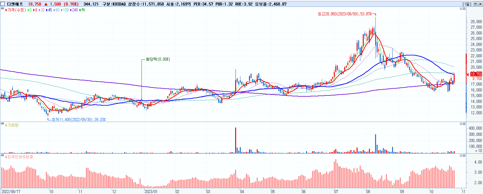 - 디엔에프 (18,750원 ▲ 8.7% , 시총: 2,170억, 거래량: 417,465, 거래대금:76억)