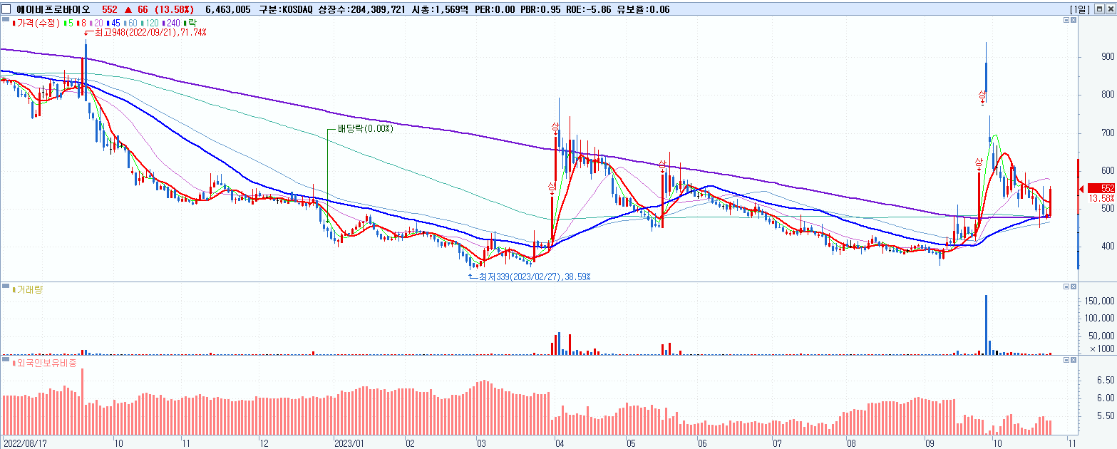 - 에이비프로바이오 (552원 ▲ 13.58% , 시총: 1,570억, 거래량: 6,614,126, 거래대금:35억)