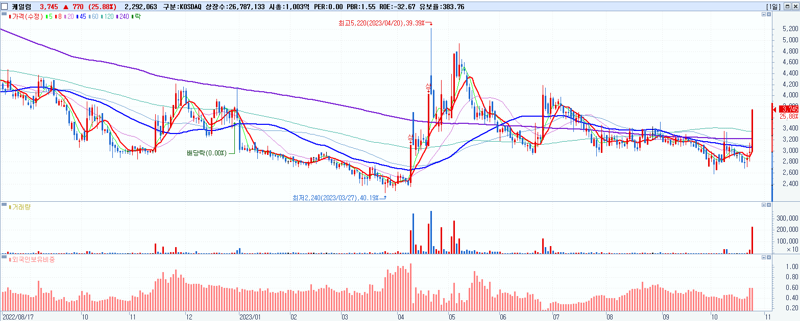 - 케일럼 (3,745원 ▲ 25.88% , 시총: 1,003억, 거래량: 2,305,771, 거래대금:81억)