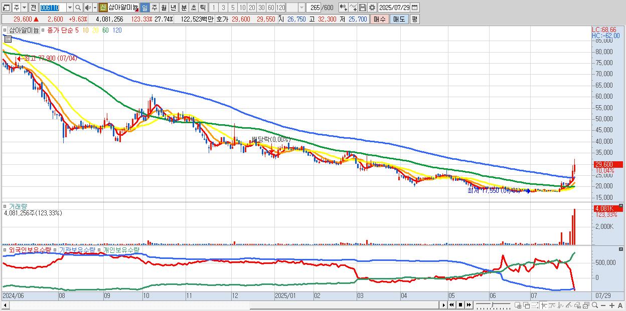 - 삼아알미늄 (30,300원 ▲ 12.22% , 시총: 4,458억, 거래량: 2,167,956, 거래대금:652억)