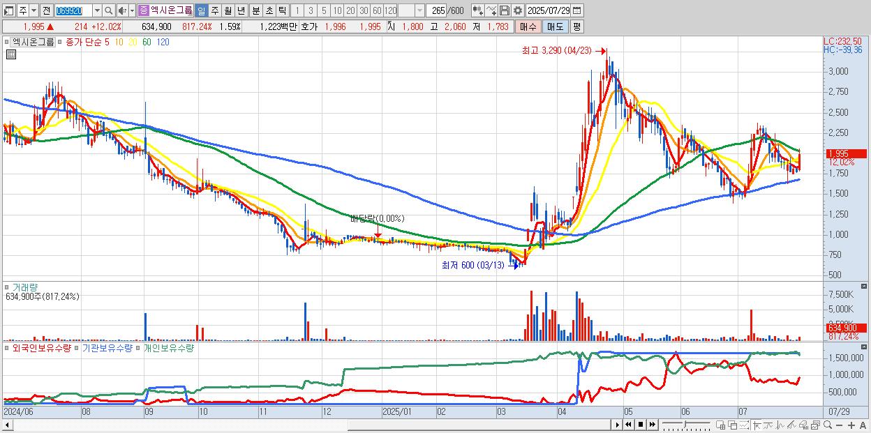 - 엑시온그룹 (1,995원 ▲ 12.02% , 시총: 798억, 거래량: 634,900, 거래대금:12억)