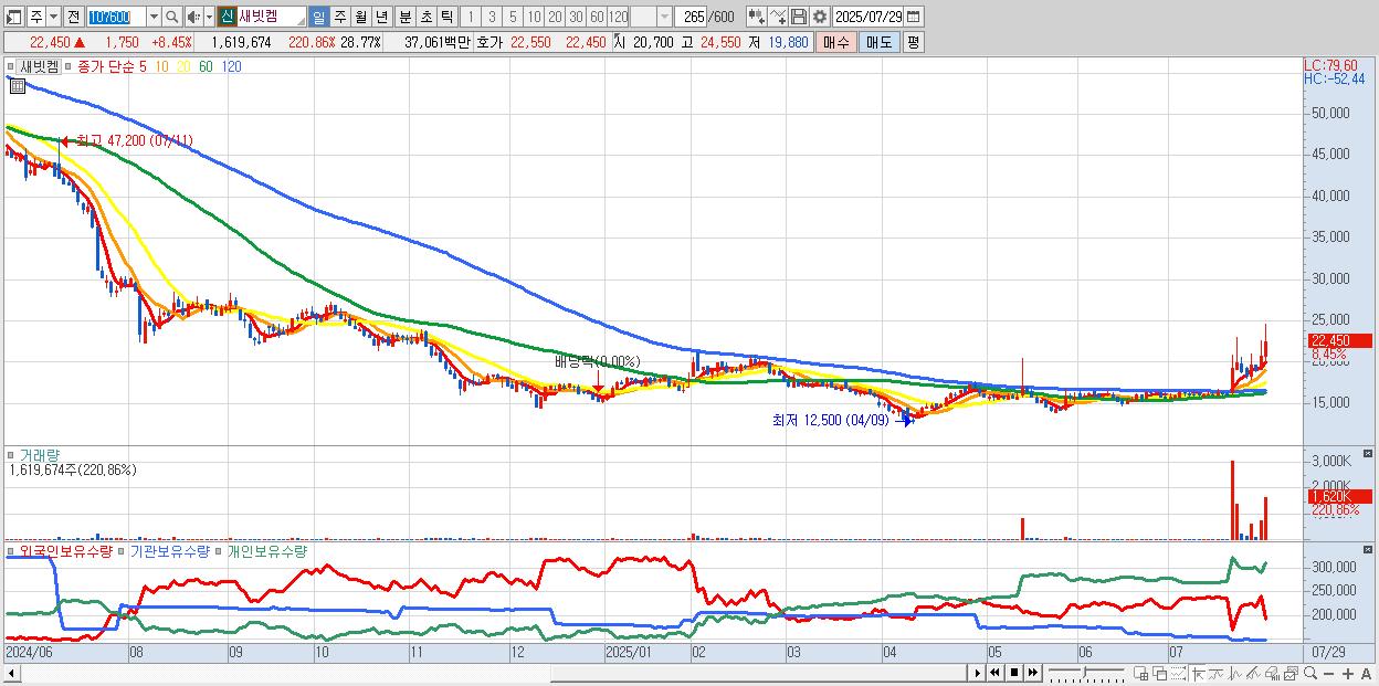 - 새빗켐 (22,450원 ▲ 8.45% , 시총: 1,264억, 거래량: 1,619,674, 거래대금:371억)