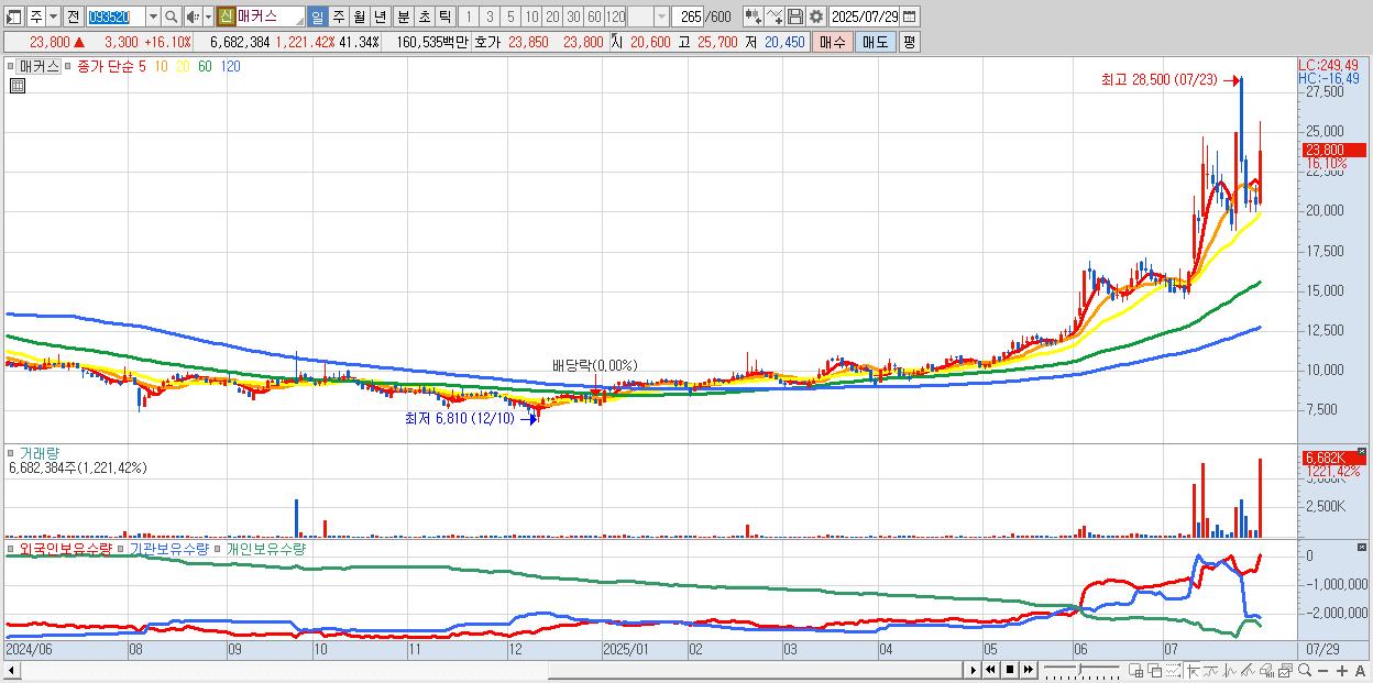 - 매커스 (23,800원 ▲ 16.1% , 시총: 3,847억, 거래량: 6,682,384, 거래대금:1,605억)