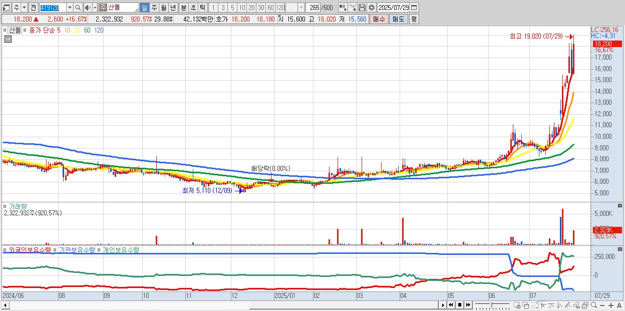 - 산돌 (18,200원 ▲ 16.67% , 시총: 1,415억, 거래량: 2,322,932, 거래대금:421억)