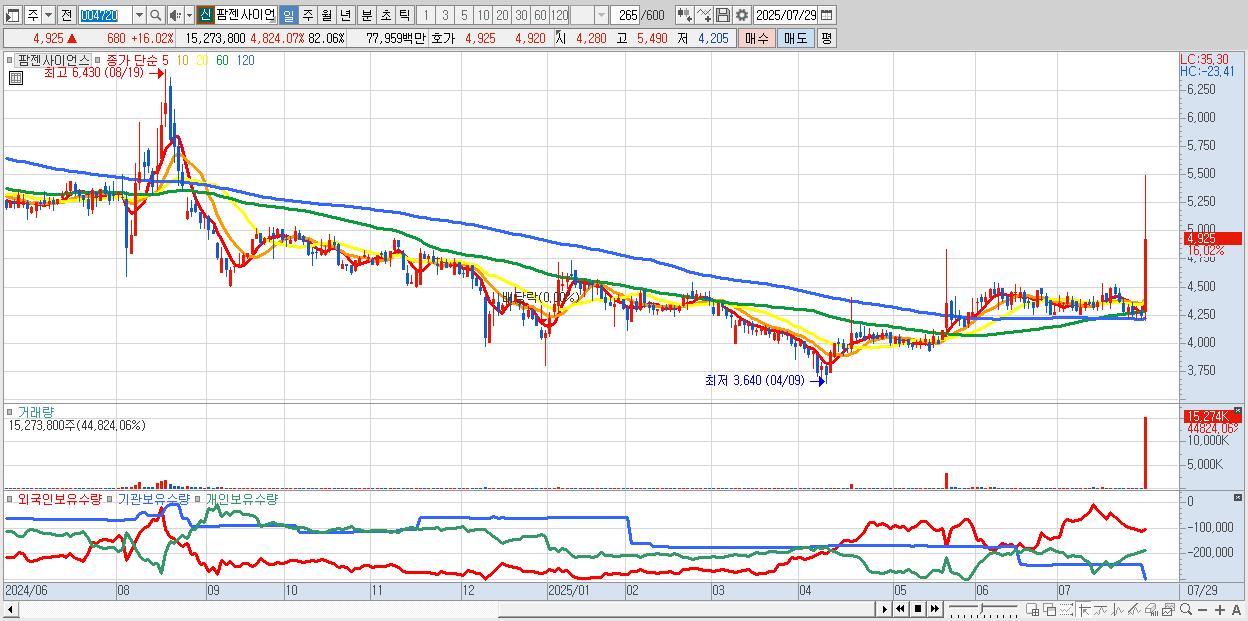 - 팜젠사이언스 (4,925원 ▲ 16.02% , 시총: 917억, 거래량: 15,273,800, 거래대금:780억)