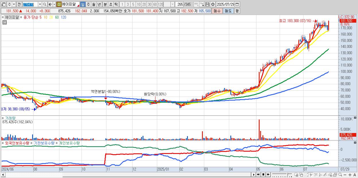 - 에이피알 (181,300원 ▲ 8.24% , 시총: 68,974억, 거래량: 538,391, 거래대금:948억)
