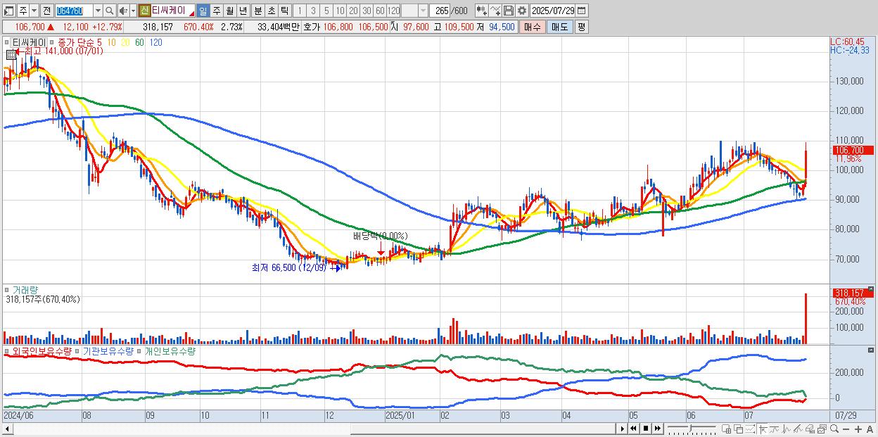 - 티씨케이 (107,100원 ▲ 13.21% , 시총: 12,504억, 거래량: 261,822, 거래대금:275억)