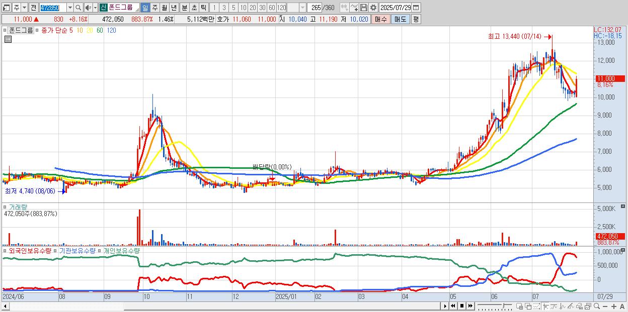 - 폰드그룹 (11,000원 ▲ 8.16% , 시총: 3,558억, 거래량: 472,050, 거래대금:51억)