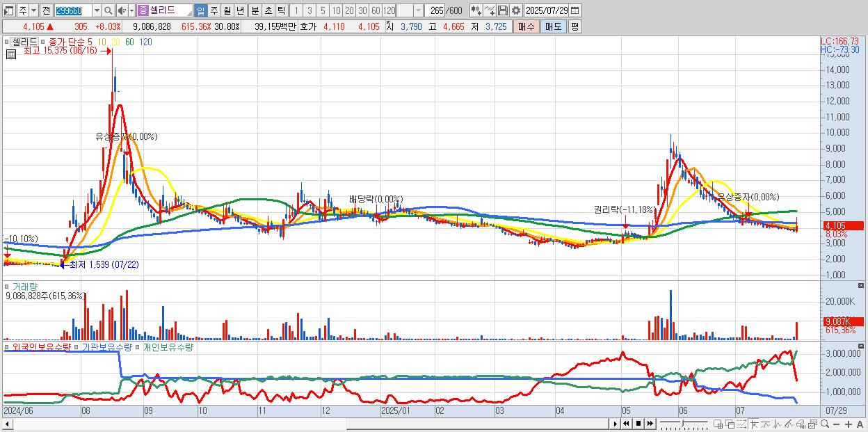 - 셀리드 (4,105원 ▲ 8.03% , 시총: 1,211억, 거래량: 9,086,828, 거래대금:392억)