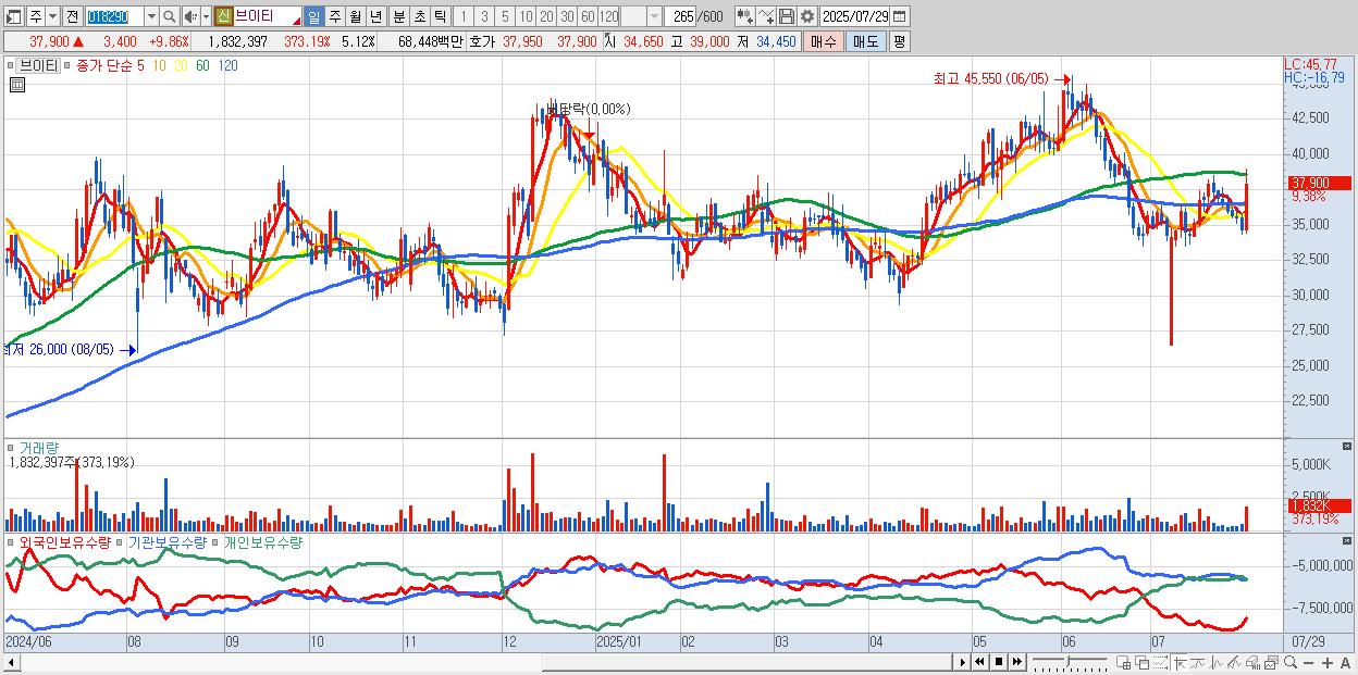 - 브이티 (37,500원 ▲ 8.7% , 시총: 13,424억, 거래량: 684,390, 거래대금:252억)