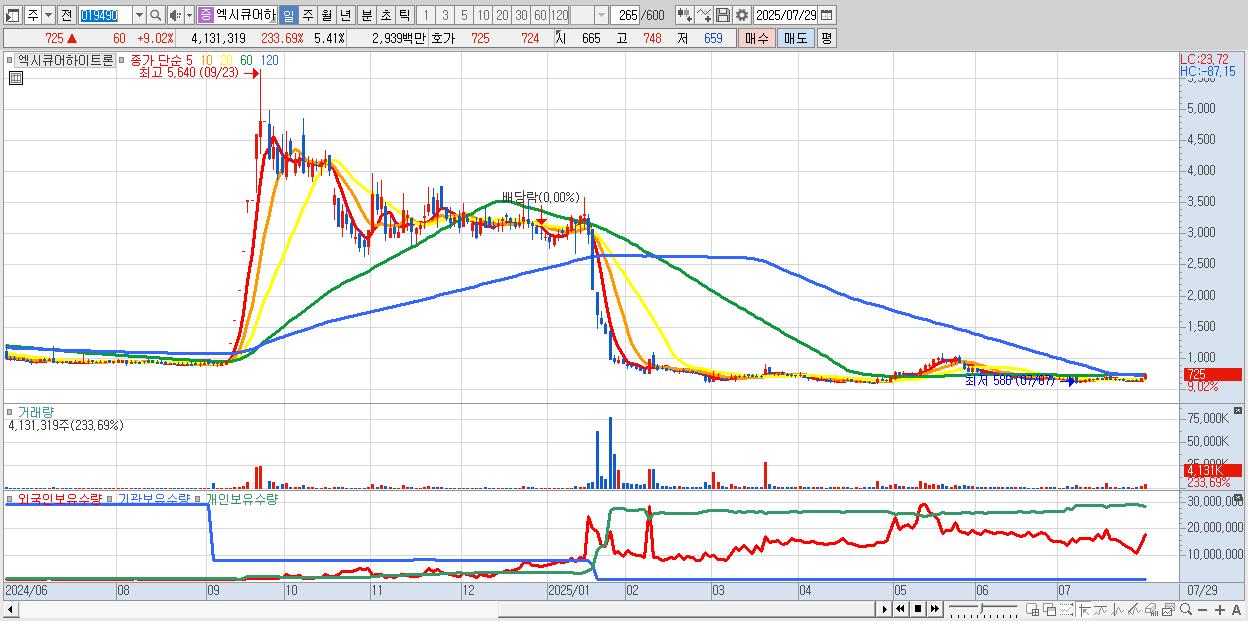 - 엑시큐어하이트론 (725원 ▲ 9.02% , 시총: 554억, 거래량: 4,131,319, 거래대금:29억)